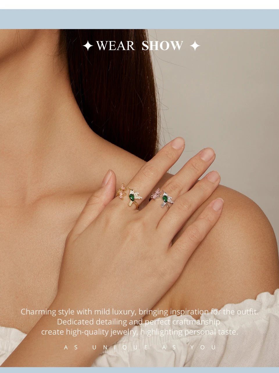Crafted from genuine 925 sterling silver and plated with white gold, this ring delivers a brilliant shine that enhances any outfit — from everyday wear to glamorous party looks 💎💫. Its open adjustable design (size 5–9) ensures a perfect fit, offering both comfort and versatility 🌿.