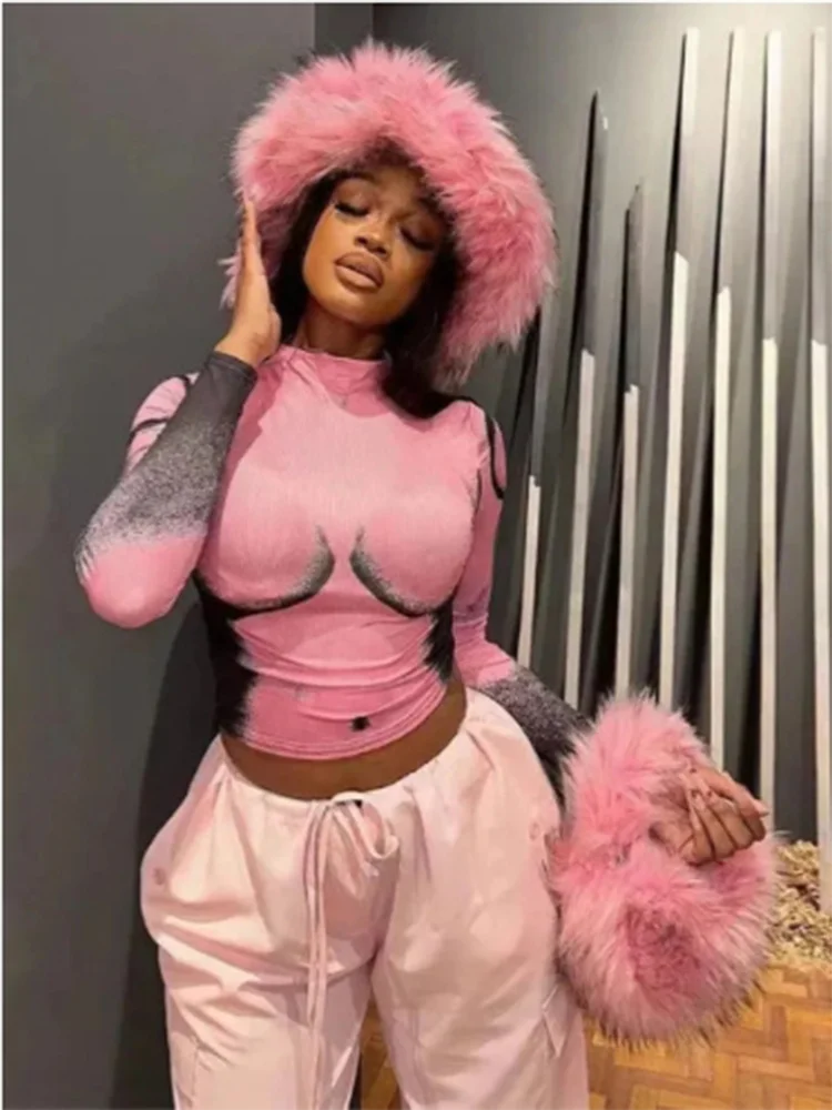 Body Portrait Printed Slim Fit Top | Women’s Long Sleeve Round Neck T-Shirt | Sexy Pink Autumn Streetwear