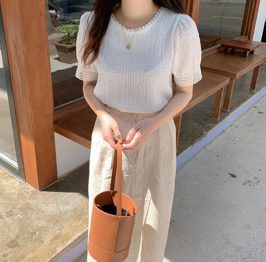 This high-end fairy-style top features delicate lace detailing, a folded doll collar, and soft bubble sleeves that bring a dreamy and feminine look to any outfit 💕.
