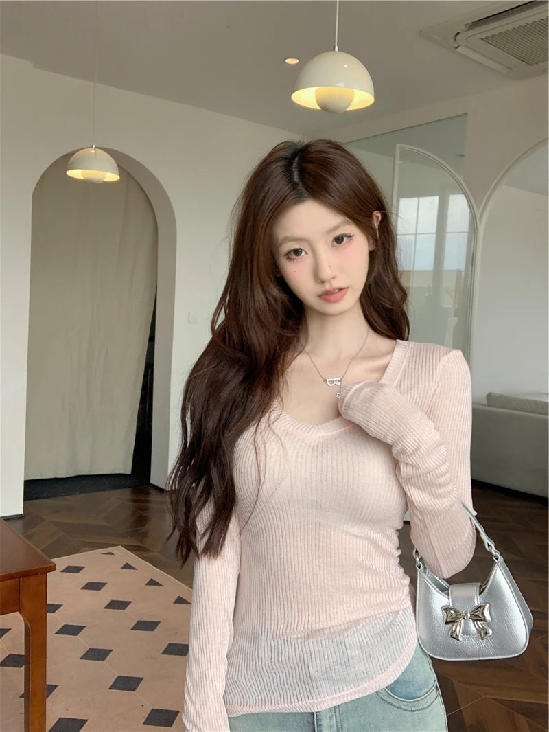 🍁 Step into Autumn 2024 with timeless elegance in this Slim Fit V-Neck Transparent Knitted Top for Women 💖. Designed with a lightweight, breathable knit and a subtle see-through texture, this top offers a perfect blend of sensuality and sophistication.