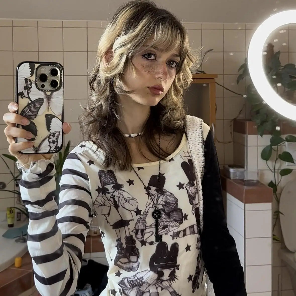 ⭐ Bring back the Y2K vibes with our Millennium Trendy Girl Star Striped Asymmetric Long Sleeve T-Shirt 💫!